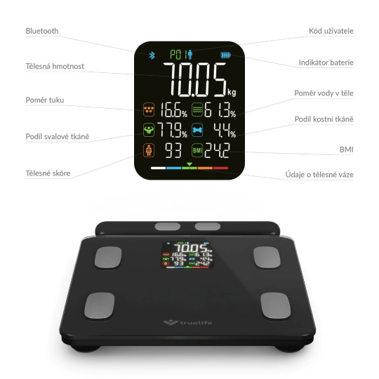 TrueLife FitScale W8 BT Čierna pomocou Bluetooth ľahko prepojíte s aplikáciou, ktorá je kompletne v češtine, prináša rad výhod a rozširuje možnosti osobnej váhy. Počas váženia sa údaje automaticky synchronizujú s aplikáciou, a to až pre 16 používateľov. Prehľadný report následne ponúka 15 indexov tela s detailným vysvetlením a odporúčaniami týkajúcimi sa stravy a cvičenia, ako postupovať k vytýčenému cieľu. Z 15 posledných meraní vytvorí aplikácia aj grafy a štatistiky, aby bol vývoj zreteľnejší. Dáta lze synchronizovať aj s aplikáciami Moving life, Apple Health, Google Fit a Fitbit.