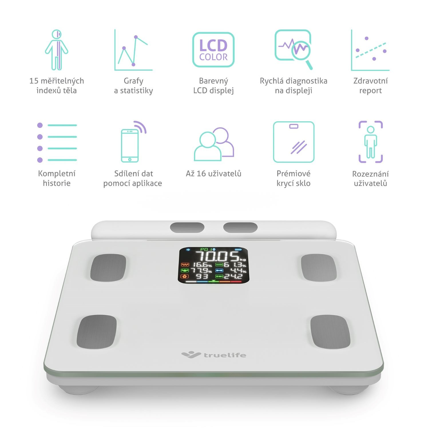 TrueLife FitScale W8 BT White pomocou Bluetooth ľahko prepojíte s aplikáciou, ktorá je kompletne v češtine, prináša radu výhod a rozširuje možnosti osobnej váhy. Počas váženia sa údaje automaticky synchronizujú s aplikáciou, a to až pre 16 používateľov. Prehľadný report potom ponúka 15 indexov tela s detailným vysvetlením a odporúčaniami týkajúcimi sa stravy a cvičenia, ako postupovať k vytýčenému cieľu. Z 15 posledných meraní vytvorí aplikácia aj grafy a štatistiky, aby bol vývoj výraznejší. Dáta možno synchronizovať aj s aplikáciami Moving life, Apple Health, Google Fit a Fitbit.