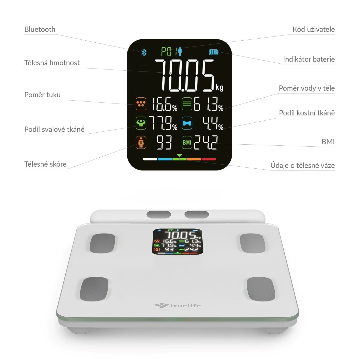 Váha TrueLife Fitscale W8 White umožňuje vďaka 8 vysoko citlivým senzorom a technológii TrueLife PrecisionIQ+® meranie celého tela – od chodidiel po ruky. Váha tak poskytuje komplexné výsledky, ktoré bežné 4-senzorové váhy nedokážu ponúknuť. Špičkové senzory dopĺňajú pokročilé algoritmy a inteligentná analýza dát pre presné a spoľahlivé meranie. Výsledkom je detailné vyhodnotenie štruktúry tela vrátane zdravotných ukazovateľov, ktoré je rýchlejšie a presnejšie než u tradičných váh. Bioelektrická impedančná analýza (BIA) vám ukáže pomer svalovej hmoty, tukov, vody, kostí na celkovej hmotnosti. Na prehľadnom LCD displeji okamžite vidíte 7 indexov tela, aplikácia potom ponúka kompletný report s 15 indexami, ktoré sú tu podrobne vysvetlené. Dozviete sa tak napríklad metabolický vek, zastúpenie bielkovín a minerálov v tele, BMI či somatotyp.