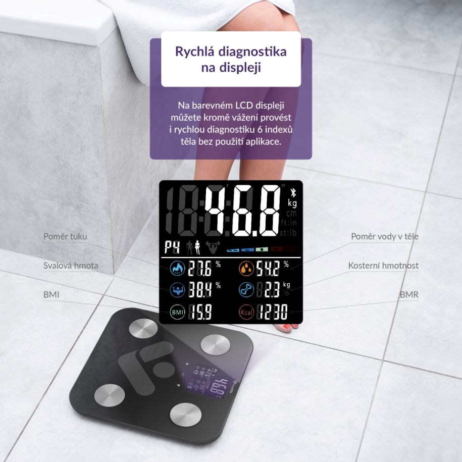 Veľký prehľadný farebný LCD displej ukáže aktuálnu hmotnosť a 7 indexov tela.