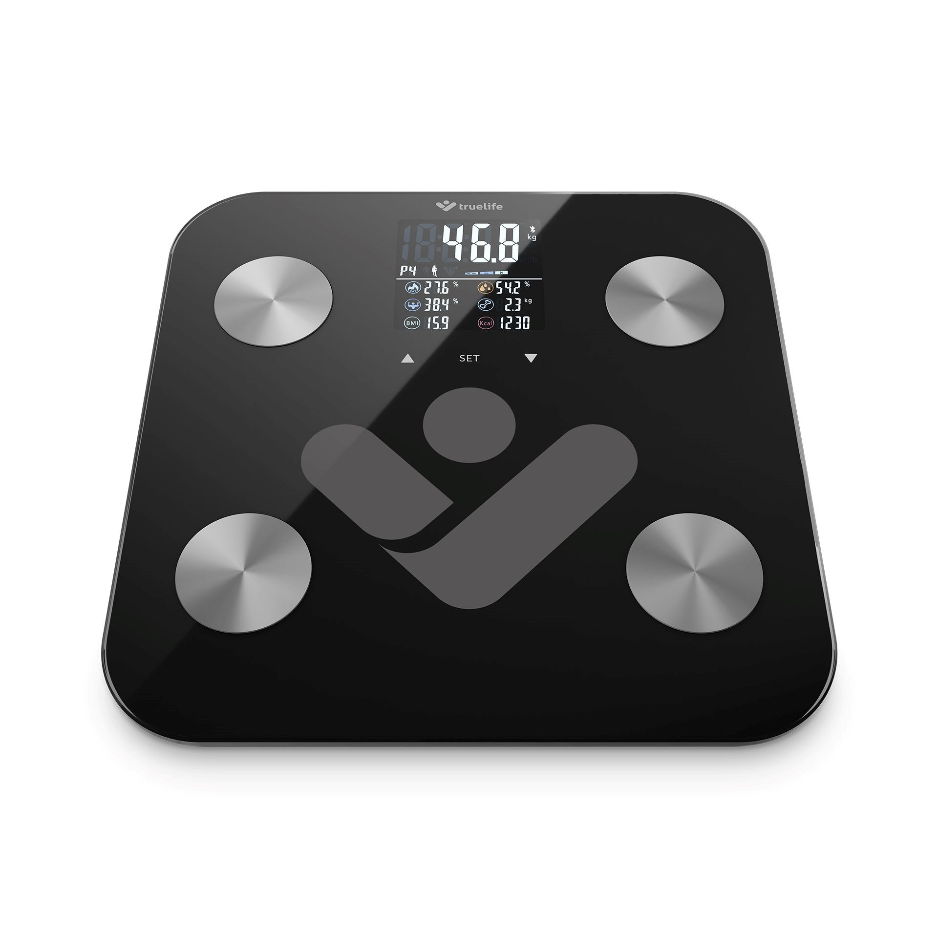Domáca hmotnosť vám príliš veľa nepovie. Osobná váha TrueLife FitShape S6 BT Black dokáže viac a umožňuje spoznať telo do detailu. Okrem presného údaja o aktuálnej hmotnosti poskytuje vďaka bioelektrickej impedančnej analýze aj rad ďalších dôležitých informácií. Prehľadný farebný LCD displej so 7 indexami tela viditeľne zobrazí požadované hodnoty. Táto rýchla diagnostika toho o tele odhalí veľa, ešte podrobnejší popis všetkých, teda až 19 merateľných telesných indexov, získate prostredníctvom mobilnej aplikácie. Váhu iba cez Bluetooth prepojíte s telefónom a ihneď máte k dispozícii kompletné reportovanie o tele a štatistiky. Váha je dokonca tak inteligentná, že automaticky rozpozná používateľa. Jej prémiové krycie sklo odolá váhe až 180 kg.