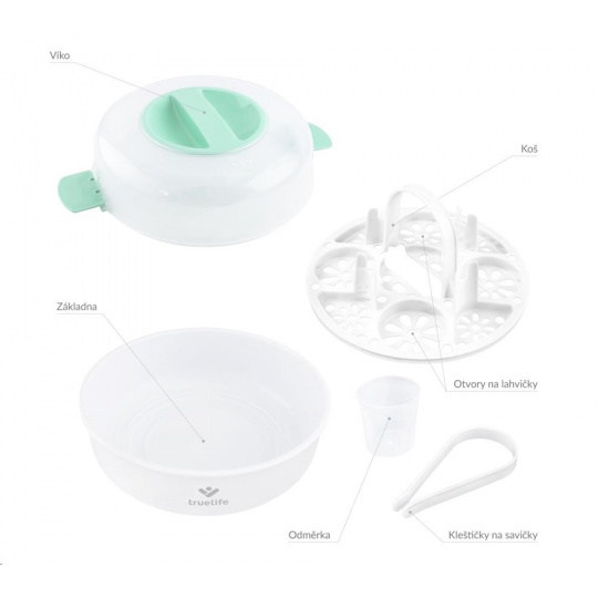 Ochrana imunitného systému vášho dieťaťa pre vás nemusí znamenať neustále vyvarenanie fľaštičiek a cumlíkov. So sterilizátorom do mikrovlnnej rúry TrueLife Invio MS5 sterilizujete detské fľaštičky, hryzátka a ďalšie predmety behom dvoch minút. Na to potrebujete len obyčajnú vodu a mikrovlnnú rúru. Sterilizátor využíva nemocničnú metódu parnej sterilizácie, ktorá je rýchla, účinná a bez chemických látok. Ničí tak 99,9 % baktérií a mikróbov, ktoré sa nachádzajú na detských predmetoch, bez poškodenia ich povrchu. Sterilizátor je navrhnutý pre väčšinu mikrovlnných rúier na trhu a zvládne väčšinu typov dojčenských fliaš. Pojme až 5 fľaštičiek naraz a ľahko sa ovláda. Vďaka kompaktnej veľkosti s ním môžete bez problémov cestovať.