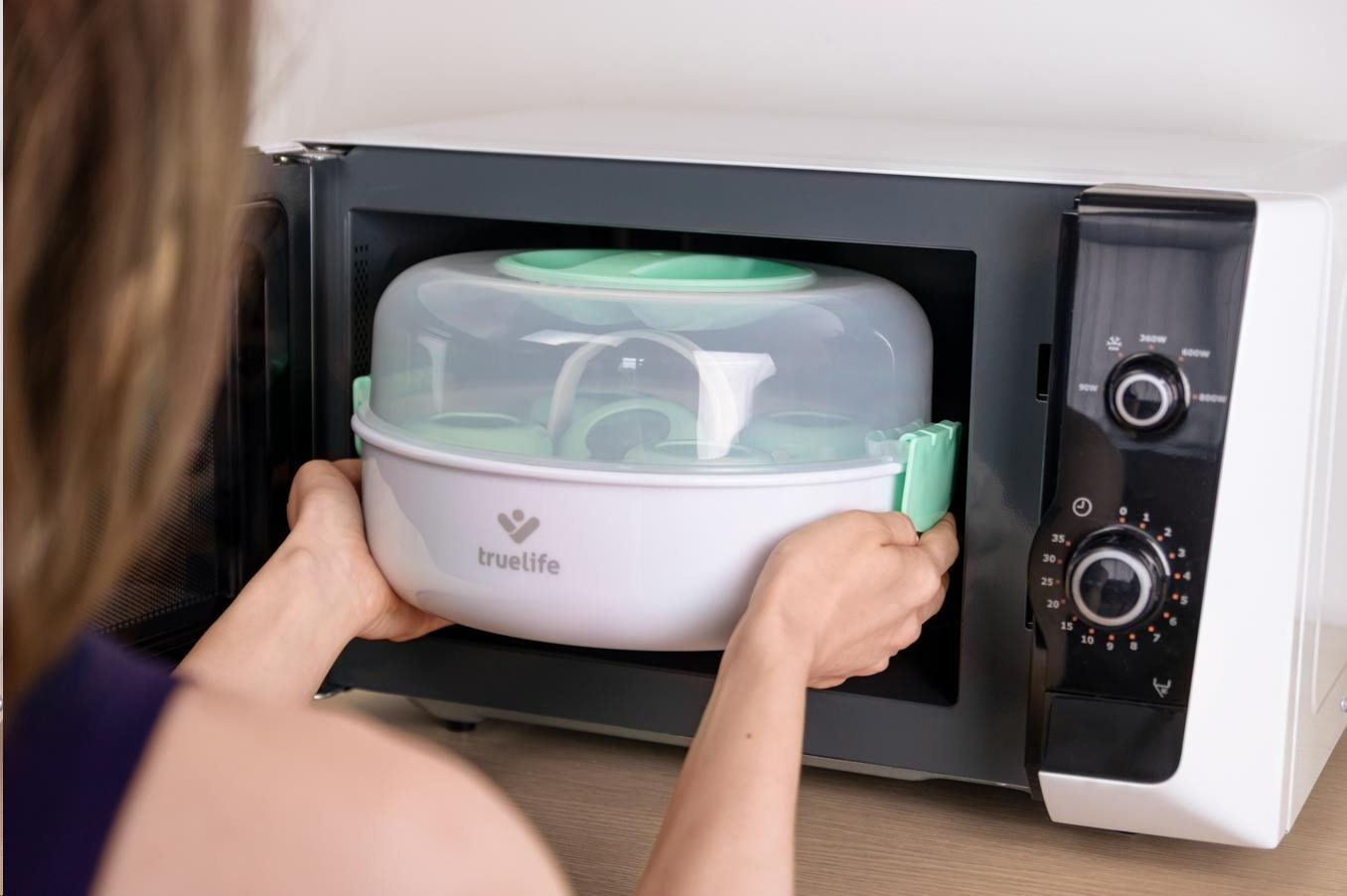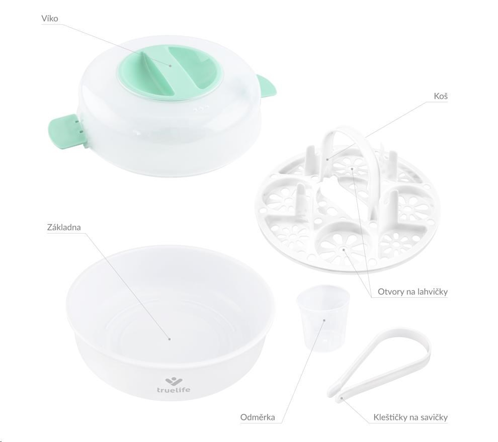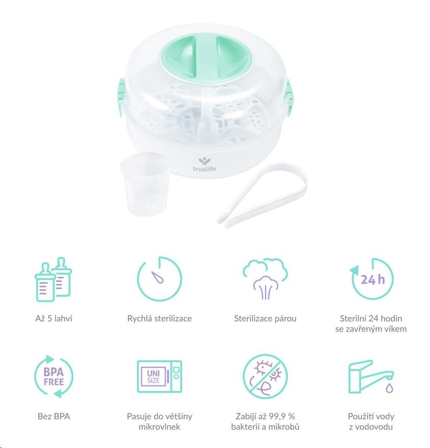 Ochrana imunitného systému vášho dieťaťa pre vás nemusí znamenať neustále vyvarenanie fľaštičiek a cumlíkov. So sterilizátorom do mikrovlnnej rúry TrueLife Invio MS5 sterilizujete detské fľaštičky, hryzátka a ďalšie predmety behom dvoch minút. Na to potrebujete len obyčajnú vodu a mikrovlnnú rúru. Sterilizátor využíva nemocničnú metódu parnej sterilizácie, ktorá je rýchla, účinná a bez chemických látok. Ničí tak 99,9 % baktérií a mikróbov, ktoré sa nachádzajú na detských predmetoch, bez poškodenia ich povrchu. Sterilizátor je navrhnutý pre väčšinu mikrovlnných rúier na trhu a zvládne väčšinu typov dojčenských fliaš. Pojme až 5 fľaštičiek naraz a ľahko sa ovláda. Vďaka kompaktnej veľkosti s ním môžete bez problémov cestovať.