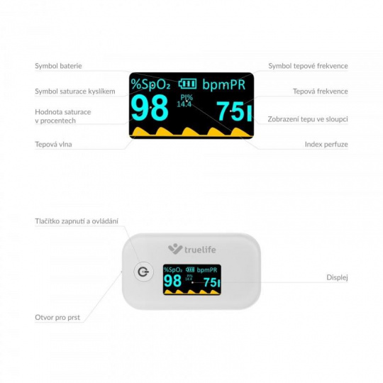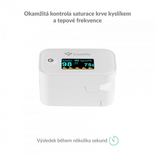 Pulzný oxymeter Truelife X3 je malý praktický prístroj, s ktorým ľahko, okamžite a bezbolestne zistíte saturáciu krvného hemoglobínu kyslíkom, tepovú frekvenciu a perfúzny index. Malý prístroj, ktorý jednoducho umiestnite na prst, je ideálnym pomocníkom pre osoby s respiračnými ochoreniami, srdcovými problémami, astmatici, ale aj vrcholových športovcov. Oxymeter je vybavený OLED displejom, ktorý zobrazuje namerané hodnoty. Displej ponúka nastaviteľnú intenzitu jasu a 6 režimov zobrazenia meraných hodnôt. Oxymeter TrueLife X3 spoľahlivo zmeria váš tep aj saturáciu krvi kyslíkom v pohodlí domova, bez nutnosti návštevy lekára a bez bolesti.