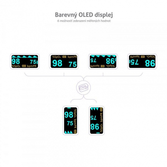 Oxymeter X3 disponuje prehľadným OLED displejom, ktorého nastavenie je možné prispôsobiť podľa vašich preferencií. Na výber je 6 možností zobrazenia meraných hodnôt. Môžete si nastaviť aj preferovanú intenzitu jasu, zvukový indikátor či zvukový doprovod tepu.