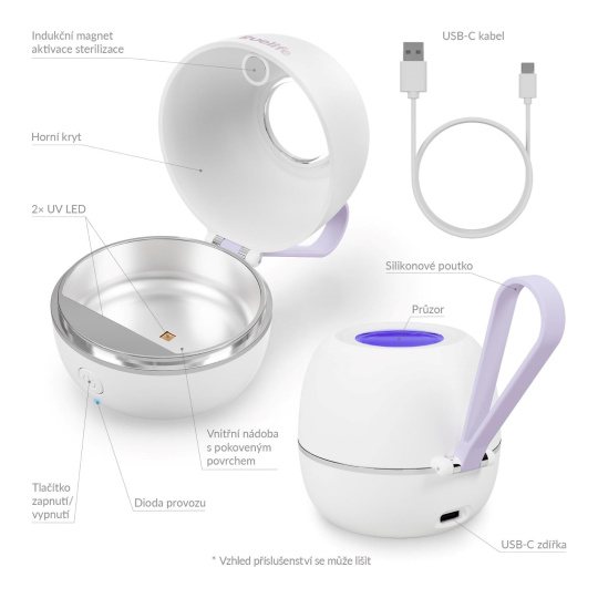 S hmotnosťou len 73 gramov a kompaktnými rozmermi sa sterilizátor zmestí do každej tašky alebo kabelky. Silikónové poutko umožňuje jednoduché prichytenie napríklad na kočík, takže ho budete mať vždy po ruke. A keď práve nie je potrebné sterilizovať cumlík, zvládne rýchlo vydezinfikovať aj menšie predmety, ako sú šperky alebo drobné doplnky.