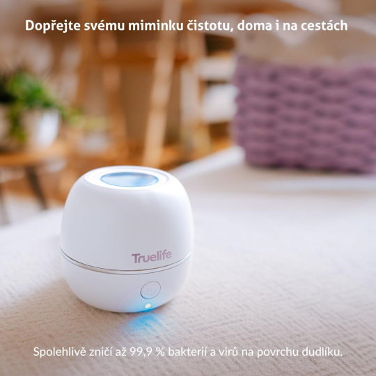 S príchodom bábätka sa každý deň naplní radosťou, ale zároveň aj okamihy, keď je potrebné konať rýchlo. Stačí chvíľa nepozornosti a cumlík skončí na zemi, zatiaľ čo vaše dieťa by ho chcelo mať späť čo najskôr. Práve v týchto chvíľach vám pomôže Truelife Pacifier UV Sterilizer S3, malý a spoľahlivý pomocník, ktorý sa vďaka svojej veľkosti zmestí do každej tašky, kabelky alebo vrecka kočíka. S praktickým siliconeovým poutkom ho môžete mať neustále pri sebe a byť si istí, že čistý cumlík je vždy po ruke. Sterilizácia prebieha úplne jednoducho a šetrne. Počas troch minút spoľahlivo odstráni cumlík až 99,9 % baktérií a vďaka bezpečnostnému systému veka sa spustí len vtedy, keď je správne uzavretý. Priehľadná okienko umožňuje sledovať proces bez unikania UV-C žiarenia, a telo z odolného plastu bez BPA zabezpečuje, že sterilizácia je úplne bezpečná pre deti. Vstavná batéria zvládne až 50 cyklov na jedno nabitie, takže sa na sterilizátor môžete spoľahnúť kedykoľvek a kdekoľvek, či už ste doma, na prechádzke alebo na cestách.