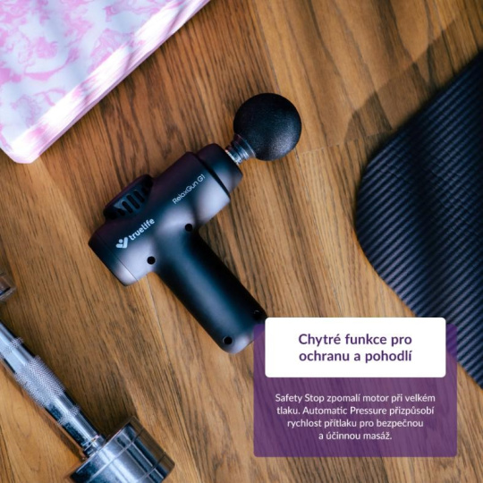 Vďaka automatickému frekvenčnému prítlaku sa masáž prispôsobí potrebám svalov a zostáva šetrná aj pri vyššej intenzite. Funkcia Safety stop spomalí motor pri prílišnom tlaku, takže sa nemusíte obávať preťaženia. Navyše s tichou prevádzkou pod 55 dB a výdržou batérie až 3 hodiny si užijete nerušenú relaxáciu doma, vo fitku aj na cestách.