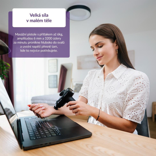 Masážna pištoľ váži len 440 g a vďaka svojmu kompaktnému dizajnu ju ľahko vezmete na cesty, do kabelky alebo do fitka. Súčasťou balenia je praktický obal.