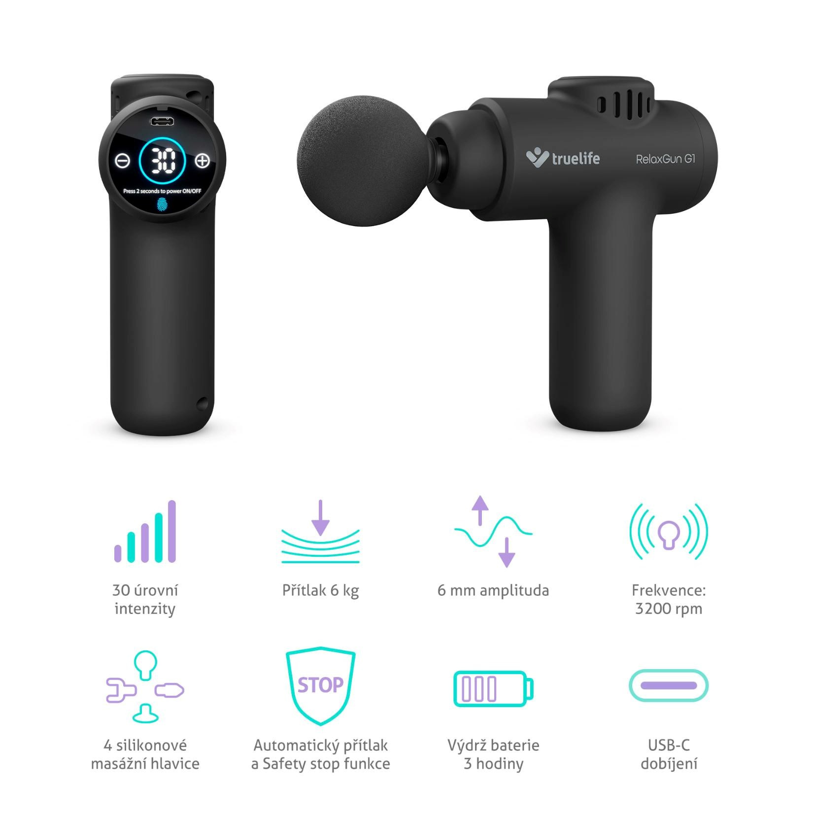Či už športujete na vrcholovej úrovni, pracujete ako fyzioterapeut, trávite väčšinu dňa pri počítači, alebo len hľadáte efektívny spôsob, ako uľaviť unaveným svalom, masážna pištoľ TrueLife RelaxGun G1 je ideálnou voľbou pre regeneráciu aj relaxáciu. Ponúka 30 úrovní intenzity, prítlak 6 kg a frekvenciu až 3200 kmitov za minútu, takže sa ľahko prispôsobí vašim potrebám – od jemnej relaxačnej masáže až po intenzívnu hĺbkovú terapiu. Štyri vymeniteľné silikónové hlavice umožňujú cielenú starostlivosť o rôzne časti tela, zatiaľ čo inteligentné funkcie ako automatický frekvenčný prítlak a bezpečnostné zastavenie (Safety stop) zaistia maximálny komfort a bezpečie. S tichou prevádzkou, dlhou výdržou batérie až 3 hodiny a moderným USB-C nabíjaním je TrueLife RelaxGun G1 ideálnym pomocníkom doma, vo fitku, v práci aj na cestách. Doprajte si starostlivosť kedykoľvek potrebujete – pre rýchlu regeneráciu, úľavu od bolesti, prevenciu zranení aj podporu celkovej pohody.