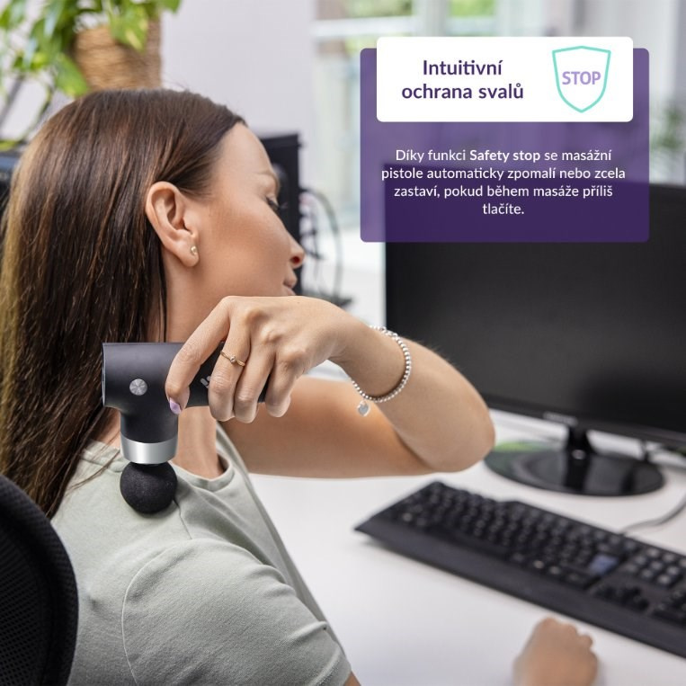 Aby sa predišlo zraneniu, masážna pištoľ je vybavená funkciou Safety Stop, ktorá automaticky spomalí alebo zastaví motor, ak počas masáže vyvíjate príliš veľký tlak. Zariadenie sa po 15 minútach masáže samo vypne. Ovládanie je veľmi intuitívne a jednoduché, pretože na jeho použitie stačí jedno tlačidlo.