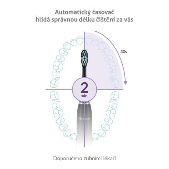 Sonická kefka TrueLife SonicBrush Clean30 je nastavená na ideálnu dobu čistenia 2 minúty a po 30 sekundách vždy krátkou pauzou upozorní, že je čas prejsť ku ďalšej sekcii. Disponuje 5 režimami, ktoré uľahčujú každodennú starostlivosť o zuby. Až uvidíte svoj žiarivý úsmev po použití režimu Shine, ktorý okrem bežného čistenia účinne odstraňuje aj škvrny od kávy a čaju, stane sa určite vašim favoritom. O bežné čistenie a odstránenie zubného povlaku sa postará režim Clean. Aj odolný zubný povlak nemá šancu pred režimom Whiten, ktorý prispieva ku bieleniu zubov. Ľudia s citlivými zubami a ďasnami ocenia špeciálny režim Sensitive. Skvelou bodkou za čistením je režim Massage stimulujúci ďasná, čím napomáha zlepšiť ich zdravie.