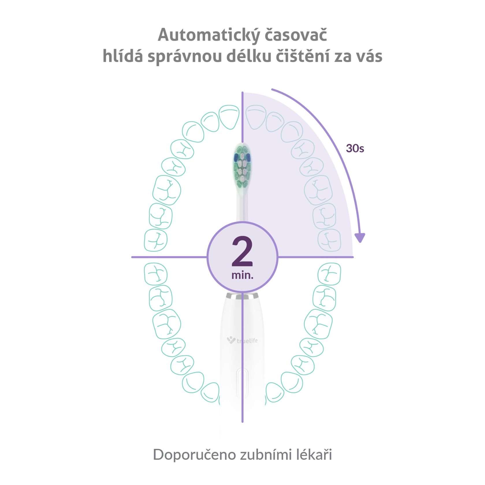 Sonická kefka TrueLife SonicBrush Clean30 je nastavená na ideálnu dobu čistenia 2 minúty a po 30 sekundách vždy krátkou pauzou upozorní, že je čas prejsť ku ďalšej sekcii. Disponuje 5 režimami, ktoré uľahčujú každodennú starostlivosť o zuby. Až uvidíte svoj žiarivý úsmev po použití režimu Shine, ktorý okrem bežného čistenia účinne odstraňuje aj škvrny od kávy a čaju, stane sa určite vašim favoritom. O bežné čistenie a odstránenie zubného povlaku sa postará režim Clean. Aj odolný zubný povlak nemá šancu pred režimom Whiten, ktorý prispieva ku bieleniu zubov. Ľudia s citlivými zubami a ďasnami ocenia špeciálny režim Sensitive. Skvelou bodkou za čistením je režim Massage stimulujúci ďasná, čím napomáha zlepšiť ich zdravie.