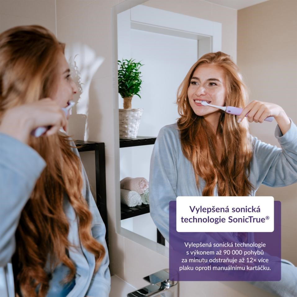 Vylepšená sonická technológia SonicTrue® pracuje na báze jemných vibrácií, čo spôsobuje šetrné čistenie plochy zubov a vírenie vody so zubnou pastou, ktoré vytvára mikrobublinky prenikajúce do medzizubných priestorov a ťažko dostupných miest.