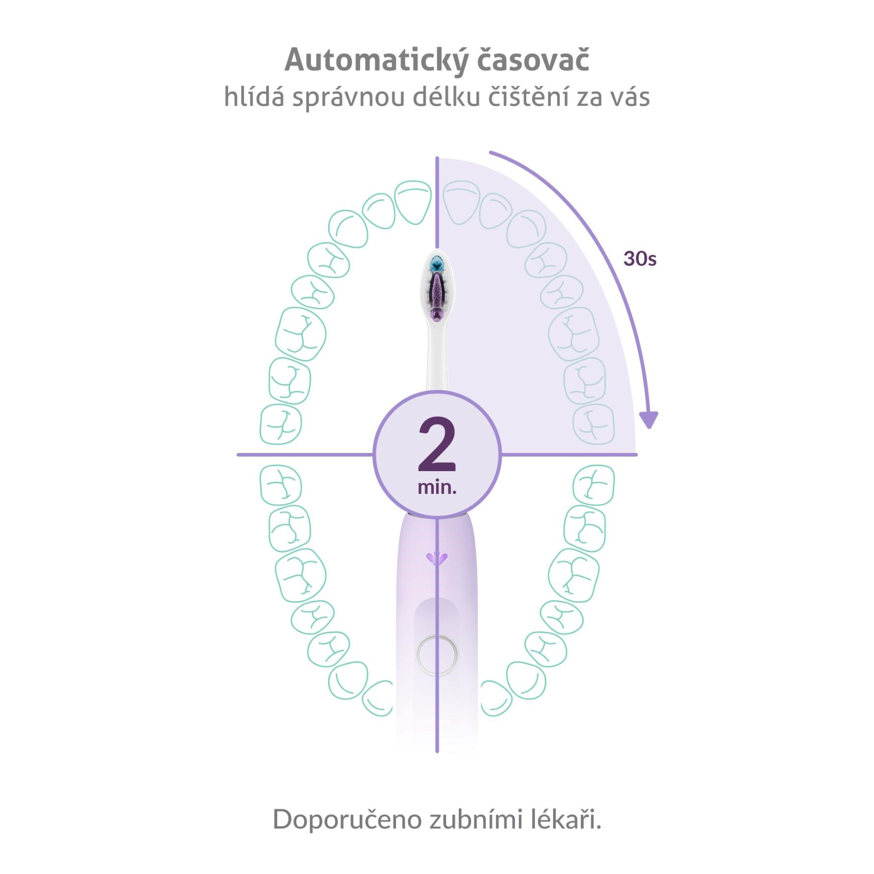 Ideálne je čistiť zuby po dobu 2 minút, čo zabezpečí automatický časovač. Navyše po 30 sekundách upozorní na potrebu presunu na ďalšiu časť úst.
