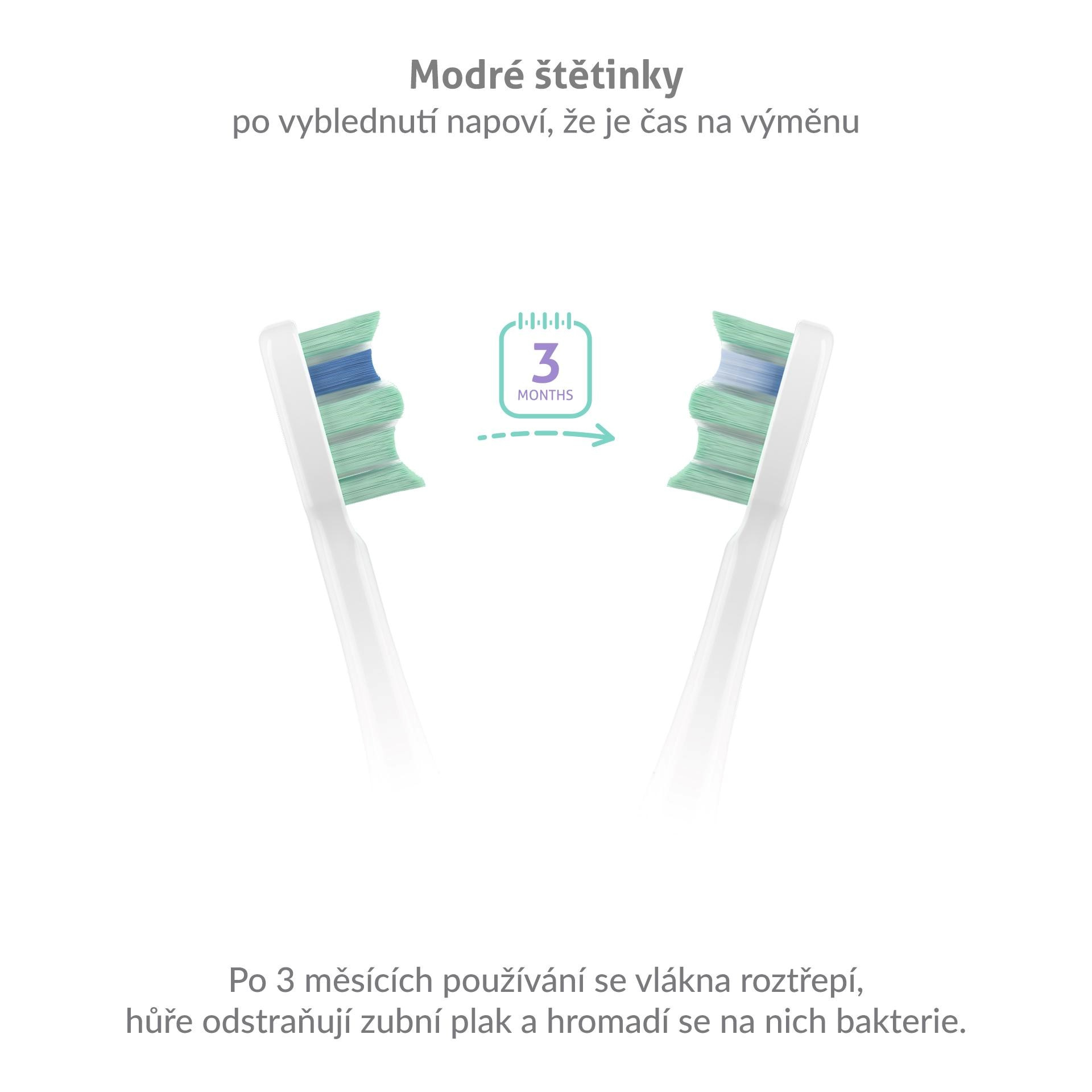 opotrebované štetiny kefky sa rozstrapate, strácajú účinnosť a hromadia sa na nich baktérie. Hlavice sonickej kefky sú osadené modrými štetinami, ktoré po 3 mesiacoch zblednú a upozornia vás tak na nutnosť výmeny.