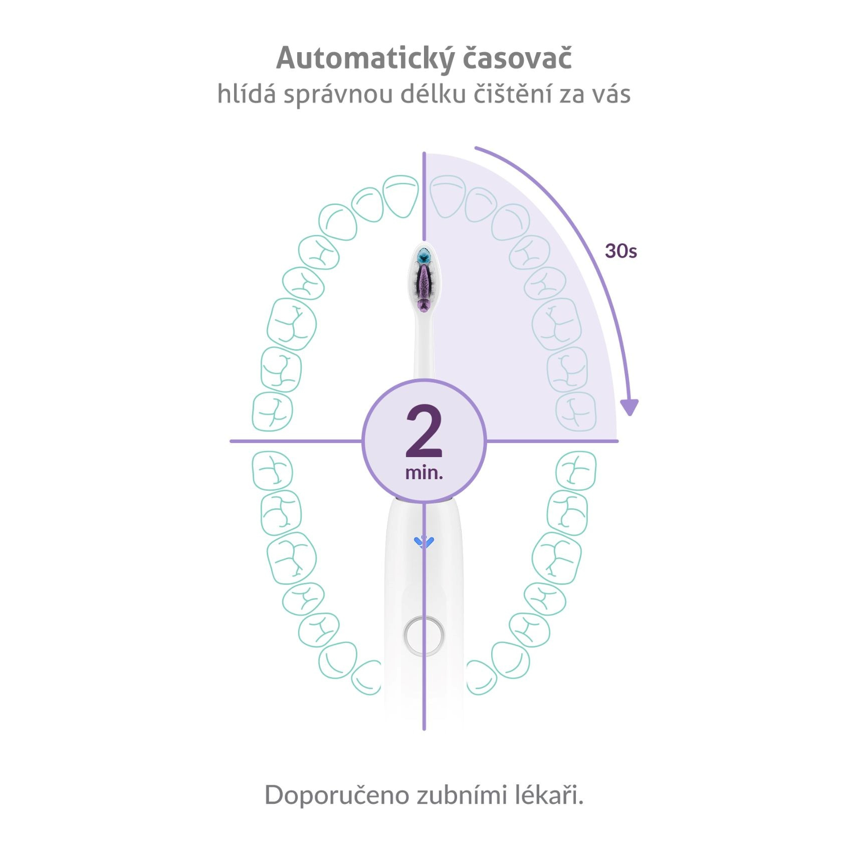 Je ideálne čistiť zuby po dobu 2 minút, čo dohliada automatický časovač. Okrem toho vždy po 30 sekundách upozorní, že je potrebné prejsť na čistenie ďalšej časti úst.