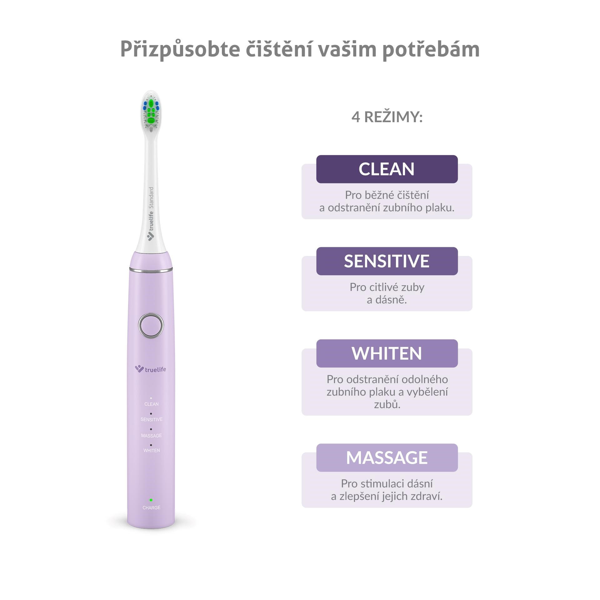 Aby sme maximalizovali účinnosť, kefka je vybavená štyrmi režimami. Spoločne sa starajú o vaše ústa – či chcete mať bielší úsmev, správne prekrviť ďasná alebo si len efektívne vyčistiť zuby.