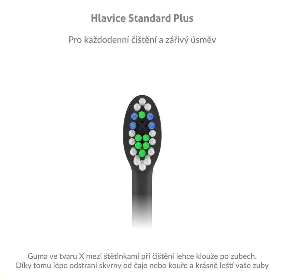 Náhradné hlavice sú špeciálne navrhnuté pre precízne čistenie zubov. Guma vo tvaru X medzi kefkami pri čistení ľahko klzné po zuboch. Vďaka tomu lepšie odstránia škvrny od čaju alebo cigariet a krásne vyleštia vaše zuby.