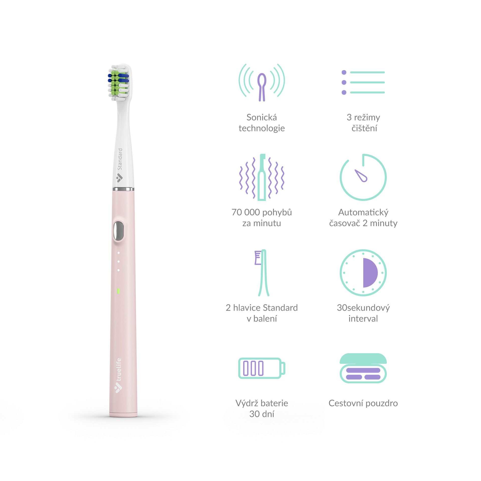 TrueLife SonicBrush Slim20 disponuje sonickou technológiou SonicTrue®, ktorá efektívne a zároveň šetrne pomocou jemných vibrácií bojuje proti zubnému povlaku. Hlava kefky kmitá rýchlosťou až 70 000 pohybov za minútu a vírením vody so zubnou pastou dochádza k čisteniu aj medzizubných a horšie dostupných priestorov. Balenie obsahuje hneď 2 čistiace hlavice, z ktorých každá vydrží až 3 mesiace používania. Moment na jej výmenu indikujú špeciálne modré štetiny, ktoré postupne blednú. Máte tak istotu, že sa nezníži účinnosť čistenia.