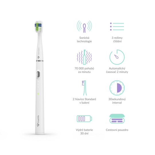TrueLife SonicBrush Slim20 disponuje sonickou technológiou SonicTrue®, ktorá efektívne a zároveň šetrne pomocou jemných vibrácií bojuje proti zubnému povlaku. Hlava kefky kmitá rýchlosťou až 70 000 pohybov za minútu a vírením vody so zubnou pastou dochádza k čisteniu aj medzizubných a horšie dostupných priestorov. Balenie obsahuje hneď 2 čistiace hlavice, z ktorých každá vydrží až 3 mesiace používania. Moment na jej výmenu indikujú špeciálne modré štetiny, ktoré postupne blednú. Máte tak istotu, že sa nezníži účinnosť čistenia.