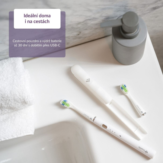 Doprajte si žiarivý úsmev a zdravé zuby, či už ste doma alebo na cestách. Sonická kefka TrueLife SonicBrush Slim20 je vďaka svojmu úzkemu telu a nízkej hmotnosti ako stvorená pre dokonalú dentálnu starostlivosť pre všetkých, ktorí sa nezastavia. Kefku stačí vložiť do cestovného puzdra, ktoré je súčasťou balenia, a môžete sa vydať kamkoľvek. Moderný kompaktný dizajn zaručuje skladnosť a ľahkú prenosnosť. Technológia SonicTrue® zaisťuje až 70 000 pohybov za minútu, k tomu pripočítajte 3 režimy čistenia spočívajúce v rôznych intenzitách kmitania a získavate maximálnu starostlivosť za minimálnu cenu. Pravidelným používaním navyše ušetríte výdavky za ošetrenie u zubára. Batéria vydrží až 30 dní používania a následne na dobitie využijete USB-C kábel, ktorý nájdete v balení podobne ako 2 čistiace hlavice Standard. Na nich podľa špeciálnych štetiniek ľahko spoznáte mieru opotrebovania. Praktický časovač stráži správny čas čistenia, kefka je vodotesná a vie si zapamätať posledný navolený režim.