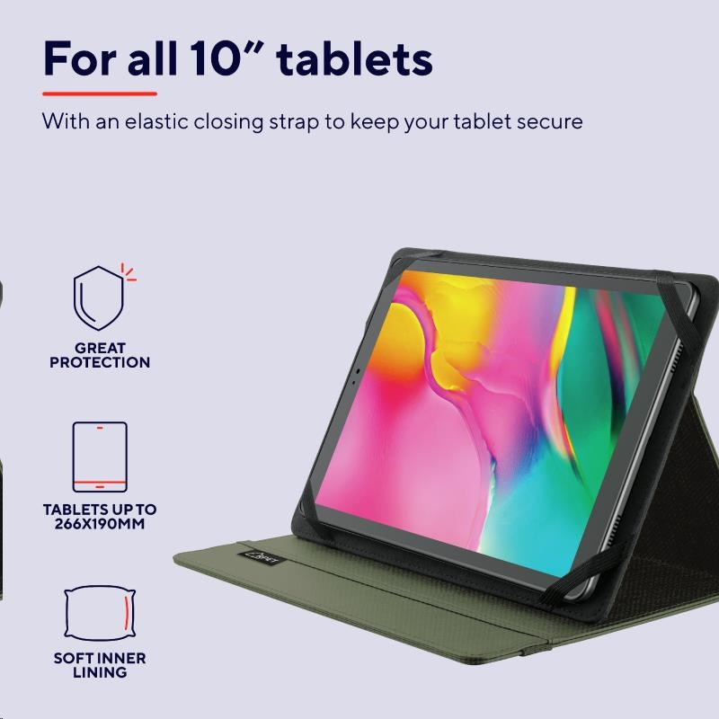 Univerzálne puzdro so stojanom na ochranu 10-palcového tabletu pred poškriabaním Vlastnosti: - Vhodné pre väčšinu 10-palcových tabletov - Chráni tablet pred poškriabaním - Stojan - Mäkký interiér - Elastický uzatvárací pásik Obsah balenia: - Puzdro so stojanom pre 10-palcové tablety Požiadavky: - 10-palcové tablety do rozmerov 266x190 mm..