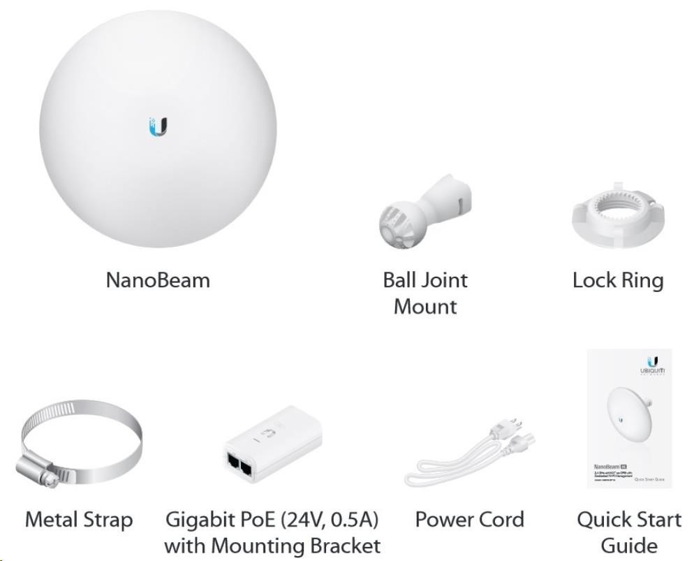 obsah balenia: - Zariadenie - Gigabitový napájací adaptér PoE 24V/0.5A - Napájací kábel - Napínacia páska - Plastový spoj + plastový zámok