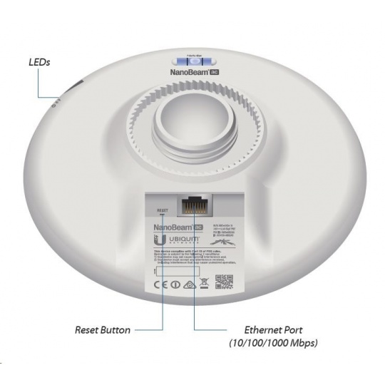 vnútri NanoBeamu sa nachádza výkonný procesor MIPS Atheros 74KC s frekvenciou 720 MHz, na ktorý nadväzuje 128 MB operačnej pamäte typu DDR2 a 8 MB pamäte Flash. Sieťový port podporuje 10/100/1000 Ethernet a možno ho použiť na napájanie jednotky pomocou dodaného pasívneho gigabitového adaptéra PoE 24V/0,5A (aktívne PoE podľa 802.3af nie je podporovaný).