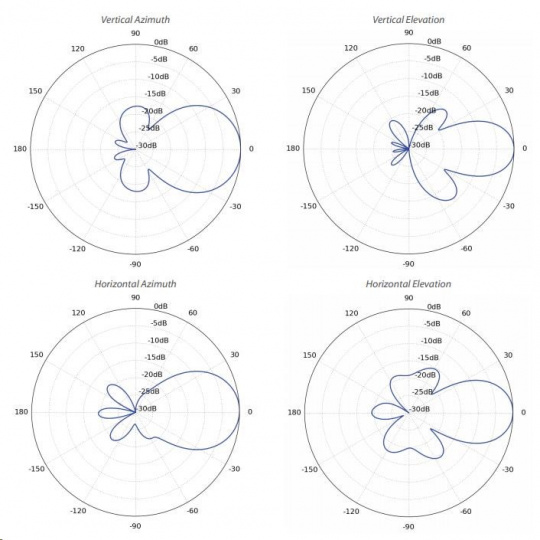 Šírka lúča 45° (H-pol) / 45° (V-pol) / 45° (elevácia)
