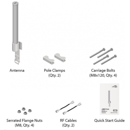 je to robustné 10dbi všesmerové anténne riešenie pre prístupové body pracujúce v pásme 2.4GHz a pomocou 802.11n v kombinácii s technológiou MIMO. Anténa má dva konektory RSMA typu žena. Súčasťou dodávky sú dva vodotesné pigtaily RSMA na pripojenie k jednotke Rocket M2, držiak pre túto jednotku a montážna súprava na stožiar, pozri. obr.