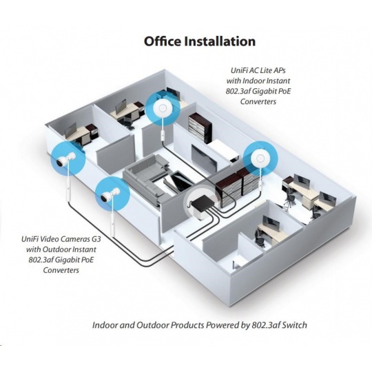 tento gigabitový konvertor možno použiť na napájanie prepínačov UBNT s aktívnym PoE podľa normy 802.3af (48 V). Prevodník komunikuje so spínačom podľa 802.3af a výstup je už klasický pasívny PoE, v tomto prípade 24V/0,5A. Môže sa používať so všetkými jednotkami Ubiquity (je kompatibilný aj s routerboardmi Mikrotik).