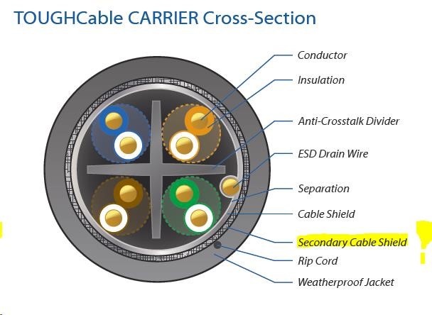 tOUGHCable CARRIER je špeciálne navrhnutý tienený kábel SFTP. Na rozdiel od kábla TOUGHCable PRO má okolo hliníkovej fólie kovové opletenie, podobne ako koaxiálne káble pre SAT/TV technológiu - zvyšuje odolnosť voči prípadnému rušeniu. Kábel Cat5e na extrémne nasadenie v najťažších poveternostných podmienkach, ktorý podstatne eliminuje riziko poškodenia vonkajších aktívnych komponentov elektrostatickým výbojom.