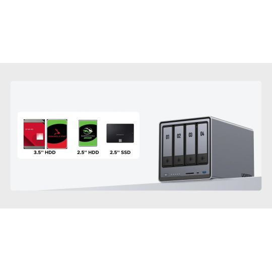 UGREEN NAS je kompatibilný s mimoriadne širokou škálou úložných diskov, vrátane 3,5„/2,5“ SATA diskov a M.2 SSD. Podporované sú všetky najobľúbenejšie značky pevných diskov a neexistuje žiadne obmedzenie na konkrétneho výrobcu.
