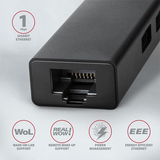 AXAGON HMA-GL3A, USB 3.rozbočovač 2. generácie, porty 3x USB-A + Gigabit Ethernet, kov, kábel USB-A 20 cm