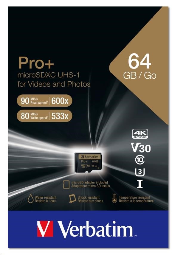 Pamäťové karty microSD Verbatim Pro+ umožňujú zachytávať video v najvyššom rozlíšení a poskytujú najvyšší výkon vašim akčným kamerám, videokamerám, smartfónom alebo tabletom.