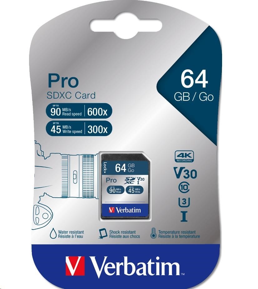 Karta VERBATIM SDXC 64GB Pro, U3, V30 (R:90/W:45 MB/s)