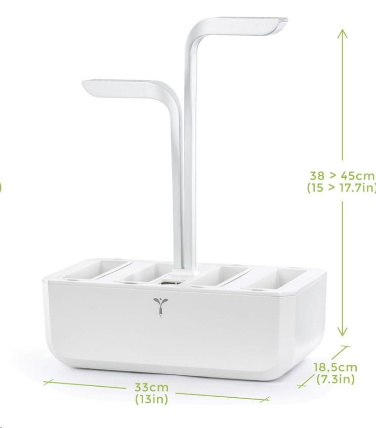 Záhradka Verejná Classic sa postará o vaše rastliny automaticky, čo znamená, že dostanú správne množstvo vody a svetla bez vášho zásahu. Integrovaná nádrž na vodu poskytuje až štyri týždne autonómneho zavlažovania, čo je ideálne pre zaneprázdnených jednotlivcov alebo časté cestovateľov. Môžete si užívať čerstvé bylinky, zeleninu a kvety s minimálnym úsilím, zatiaľ čo záhradka pracuje za vás. Spotreba energie záhradky je veľmi nízka, príkon LED je len 10 W. Vzhľadom na to, že zavlažovanie nie je riešené pumpou, záhradka nevydáva žiadny zvuk.