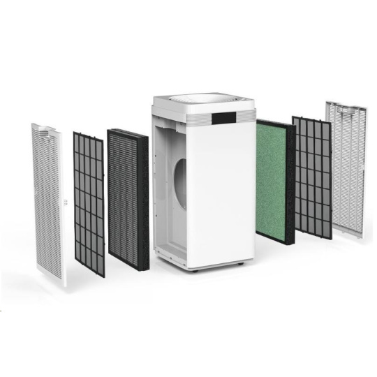 - Složení filtračnej sady: 2x sada separátnych filtrov so 4-stupňovou filtráciou, 1) základný filter, 2) HEPA filter, 3) Uhlíkový filter, 4) Ionizer