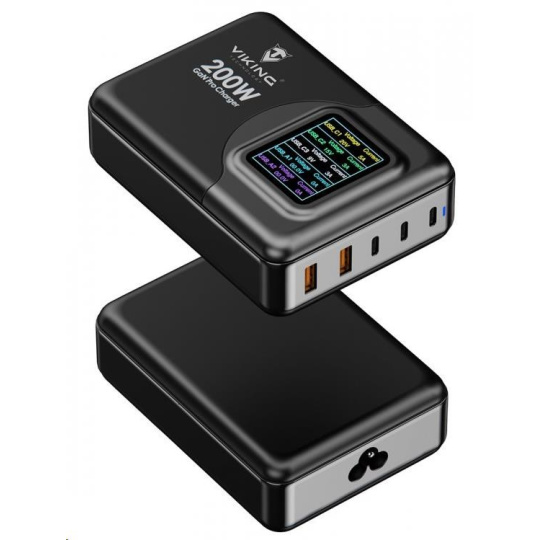 So tromi výstupmi USB-C PD (100W max.) a dvomi USB-A QC (18W max.) je táto nabíjačka pripravená dodať energiu piatim zariadeniam súčasne, a to s maximálnym výkonom až 200W. So Viking USB GaN nabíjačkou 200W PD Pro si môžete byť istí, že vaše elektronické zariadenia budú nabité a pripravené na akciu v rekordnom čase. Inteligentná technológia adaptéra Viking Gan 200W PD Pro dokáže rozdeliť nabíjací výkon podľa počtu využitých výstupov, tak aby bolo nabíjanie jednoduché a efektívne pre všetky pripojené zariadenia. Rozdelenie energie a priebeh nabíjania môžete sledovať na prehľadnom farebnom displeji.