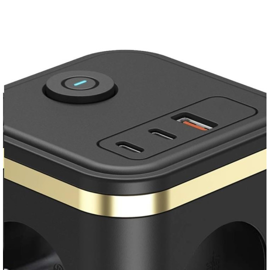 Viking síťový adaptér YC33, 3x 230 V, 1x USB-A, 2x USB-C, tlačítko ON/OFF, délka 1,4 m, černá