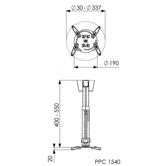 - 4 nastaviteľné montážne ramená s dosahom 30-337 mm