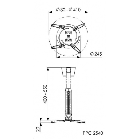 - 4 nastaviteľné montážne ramená s dosahom 30-410 mm