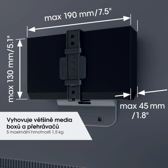 Väčšina ľudí dáva prednosť tomu, aby media prehrávače neboli viditeľné. Spoločnosť Vogel's ponúka praktické riešenie. Držiak TVA 6400 je ideálny na bezpečnú a neviditeľnú inštaláciu media boxu za televízor. Držiak TVA 6400 je vhodný takmer na všetky media boxy s maximálnymi rozmermi 190 x 130 x 45 mm a maximálnou hmotnosťou 1,5 kg.