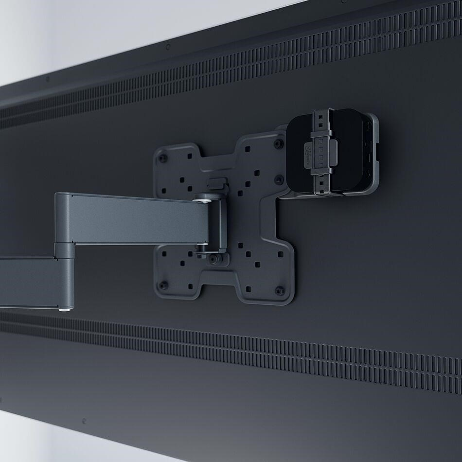 Držiak media boxu je možné ľahko nainštalovať za televízor troma spôsobmi: priamo na televízor, na nástenný držiak televízora alebo na stenu. Je vyrobený z robustného ABS s pružným univerzálnym remienkom, neobsahuje žiadne kovové časti, a preto nijako neovplyvňuje bezdrôtový prenos signálu.