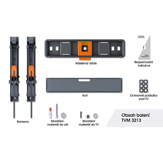 S násteným držiakom TVM 3213 rady COMFORT Tilt volíte štýl, bezpečnosť a príjemný zážitok zo sledovania. Nástenný držiak je ideálny pre prípady, keď je televízor umiestnený na stene o niečo vyššie, napríklad v spálni. Môžete ho nakloniť až o 20° a vytvoriť tak ideálny pozorovací uhol. Nástenný držiak je vhodný pre televízory s uhlopriečkou od 19 do 43 palcov a hmotnosťou do 15 kg. Televízor si naozaj užijete, až keď si ste istí, že je pekne a bezpečne namontovaný. Štýlový držiak TVM 3213 vám túto istotu poskytne. Nástenný držiak je navrhnutý a vyrobený na dlhodobé intenzívne používanie.