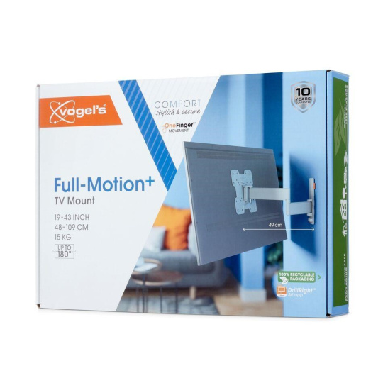 TVM 3243 je štýlový nástenný TV držiak rady COMFORT Full-Motion+ a s ním si vyberáte bezpečnosť, dizajn a optimálne pohodlie pri sledovaní. Držiak je veľmi robustný a vydrží intenzívne používanie. Pretože sa môže otáčať až o 180°, môžete si sledovanie TV vychutnať z akéhokoľvek uhla v miestnosti. Naklápanie je možné až do uhla 20° (10° hore a dolu). TVM 3243 je vhodný pre televízory s uhlopriečkou od 19 do 43 palcov a hmotnosťou do 15 kg.