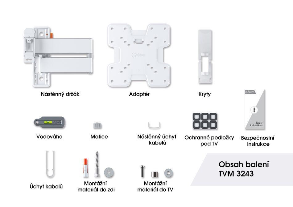 TVM 3243 je štýlový nástenný TV držiak rady COMFORT Full-Motion+ a s ním si vyberáte bezpečnosť, dizajn a optimálne pohodlie pri sledovaní. Držiak je veľmi robustný a vydrží intenzívne používanie. Pretože sa môže otáčať až o 180°, môžete si sledovanie TV vychutnať z akéhokoľvek uhla v miestnosti. Naklápanie je možné až do uhla 20° (10° hore a dolu). TVM 3243 je vhodný pre televízory s uhlopriečkou od 19 do 43 palcov a hmotnosťou do 15 kg.
