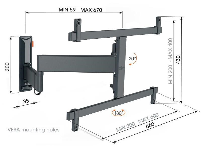 - Otočte televízor až o 180° vďaka 67 cm dlhým ramenám