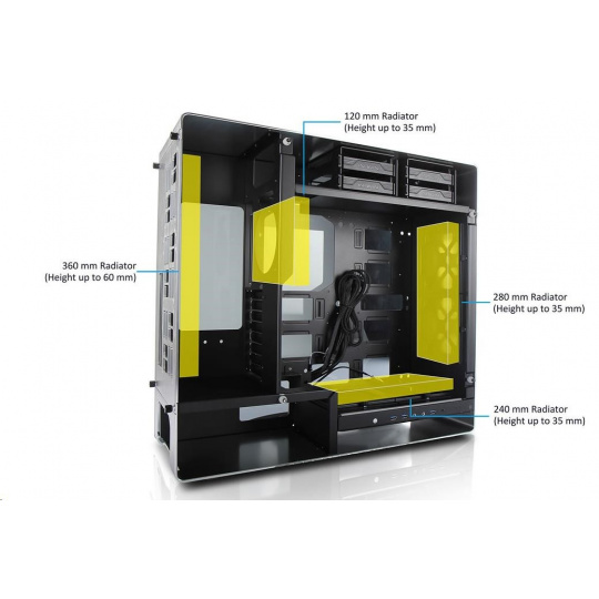 Oddelené pozície pre HDD a PSU zabezpečujú ideálne prúdenie vzduchu cez zadné vetracie otvory do vonkajšieho priestoru bez toho, aby teplému vzduchu bránili základné dosky alebo grafické karty.